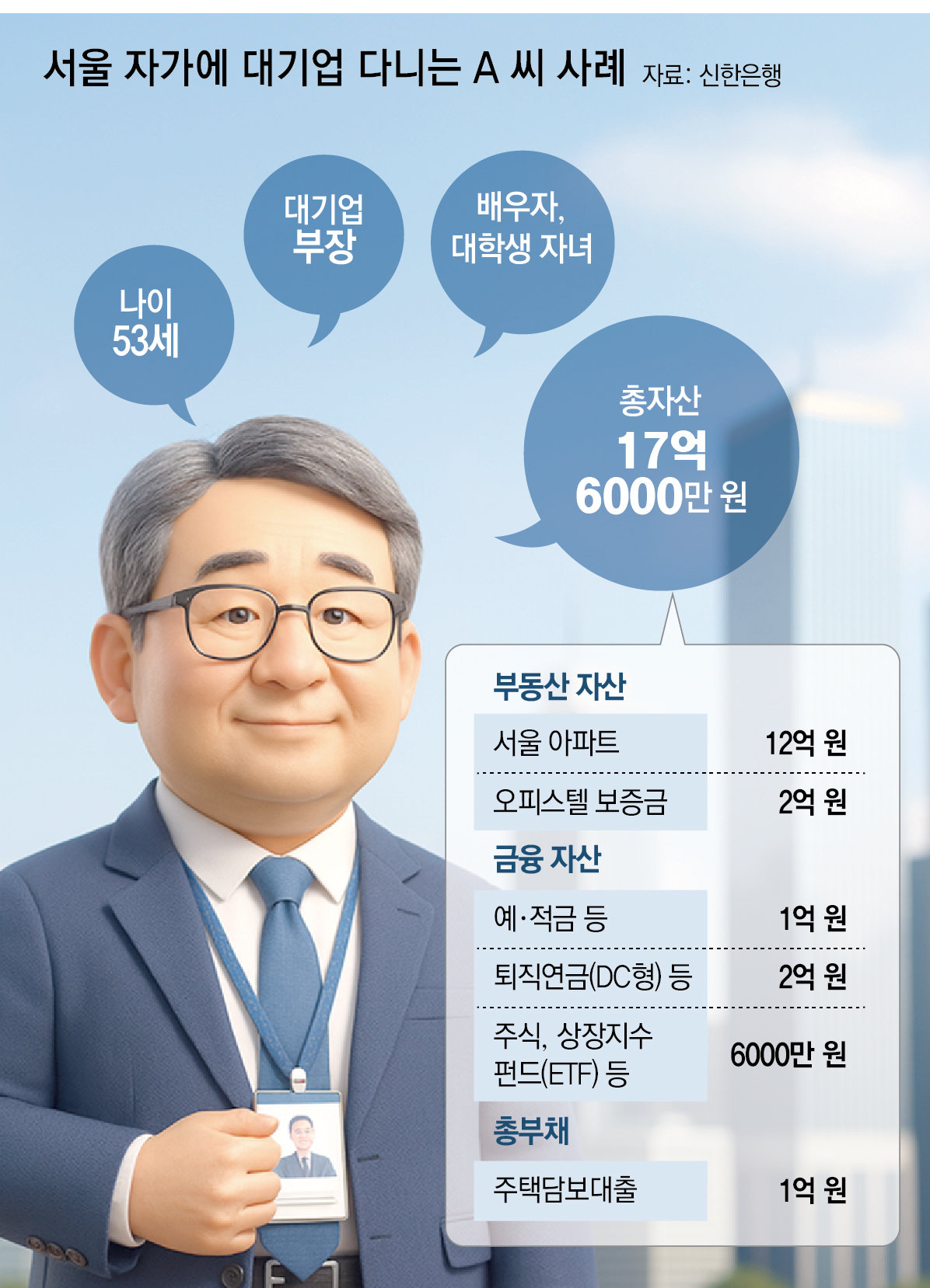 대기업에 다니는 A 씨는 배우자와 대학생 자녀를 부양하고 있다. 12억 원짜리 서울 아파트 및 오피스텔 보증금 2억 원과 약 3억 원에 달하는 예·적금, 퇴직연금, 주식 자산을 갖고 있다. 빚으로는 주택담보대출 약 1억 원을 갚아 나가고 있다.