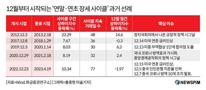 12월부터 이듬해 초까지 이어지는 일명 '연말∙연초 사이클' 기간에는 정책, 대외적 이슈, 유동성 등의 요인에 따라 기술 성장주가 뚜렷한 강세 또는 약세의 흐름을 보여왔다. 이들 3대 요인이 긍정적으로 나타날 경우 앞서 크게 하락했던 저평가된 우량주들이 반등할 가능성이 커질 전망이다.