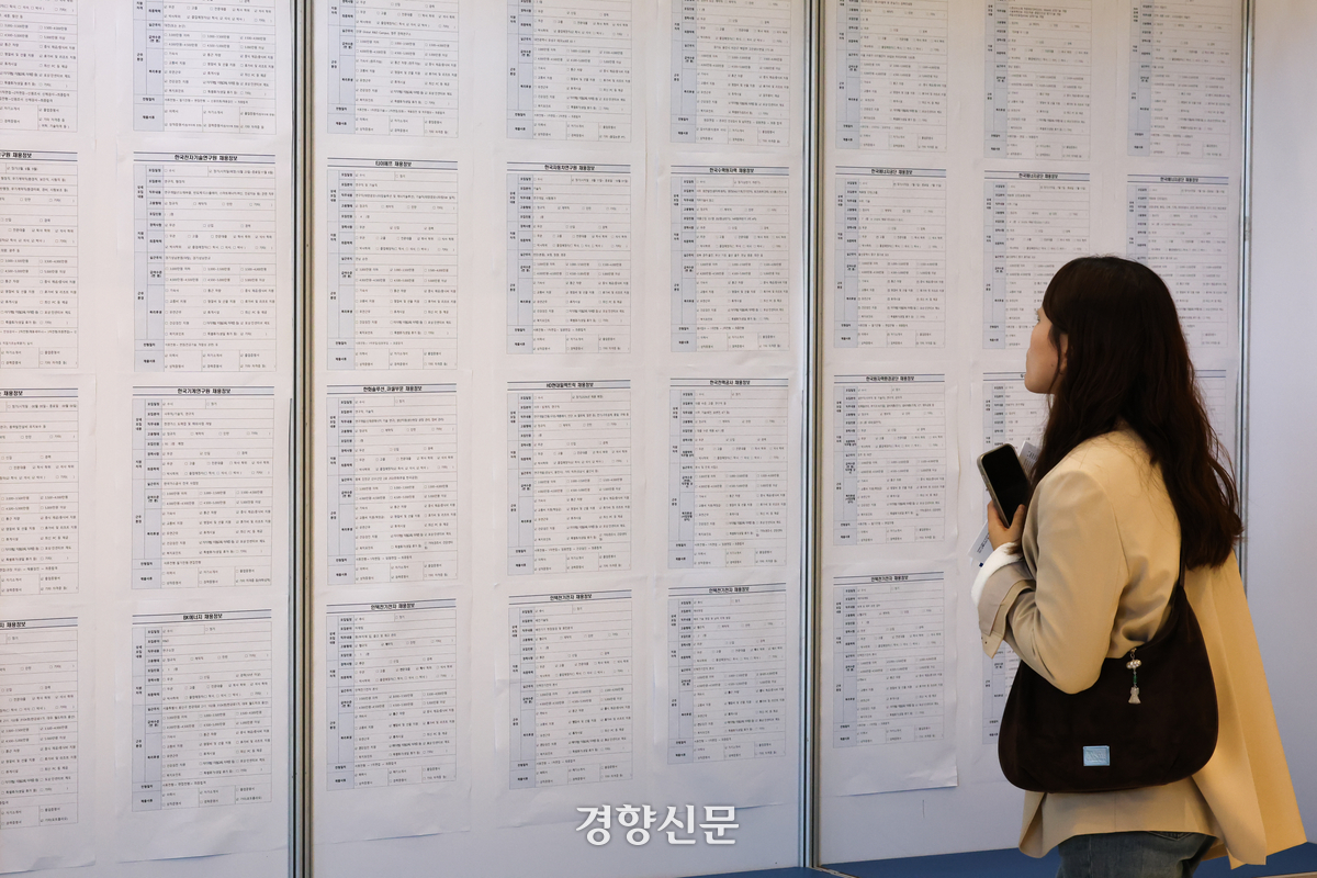 16일 서울 서초구 엘타워에서 열린 2025 기후에너지 일자리 박람회에서 구직자들이 채용 게시판을 살펴보고 있다. 성동훈 기자 |