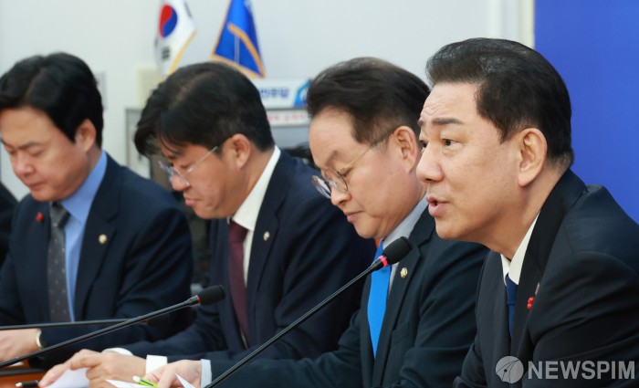 [서울=뉴스핌] 김학선 기자 = 김병기 더불어민주당 원내대표가 9일 서울 여의도 국회에서 열린 원내대책회의를 주재하며 발언하고 있다. 2025.12.09 yooksa@newspim.com