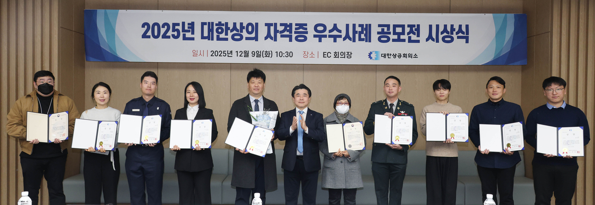 컴퓨터활용능력, 유통관리사, 워드프로세서 등 대한상공회의소가 시행하는 국가 자격을 취득해 의미 있는 전환점을 마련한 이들에게 수여하는 ‘대한상의 자격증 우수 사례 공모전’ 시상식이 9일 열렸다. 올해는 최우수상 3명, 우수상 8명(군인 3명 포함), 장려상 10명 등 21명이 선정됐다.