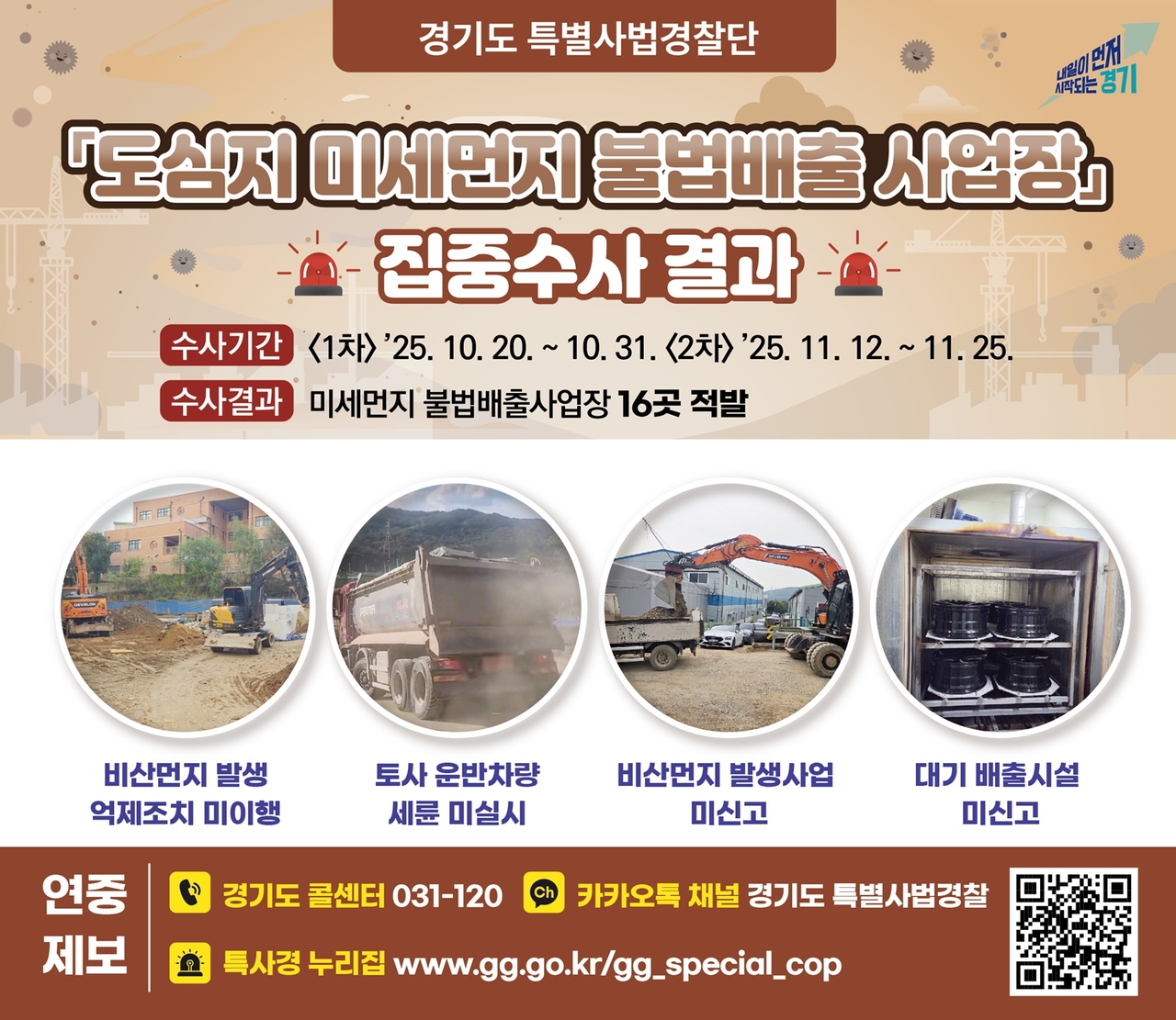 이번 수사는 11월을 기점으로 미세먼지 농도가 상승하는 시기적 특성을 고려해 1차 10월 20일부터 31일까지, 2차 11월 12일부터 25일까지 두 차례에 걸쳐 이뤄졌다. 도심지 내 건설현장·레미콘 제조업체 등 비산먼지 발생사업장과 2차 미세먼지의 주요 생성물질인 질소산화물, 황산화물을 배출하는 대기배출시설을 중점으로 단속했다.