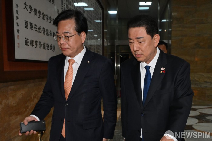 [서울=뉴스핌] 정일구 기자 = 김병기 더불어민주당 원내대표와 송언석 국민의힘 원내대표가 9일 서울 여의도 국회에서 우원식 국회의장 주재 회동을 마치고 이동하고 있다. 2025.12.09 mironj19@newspim.com