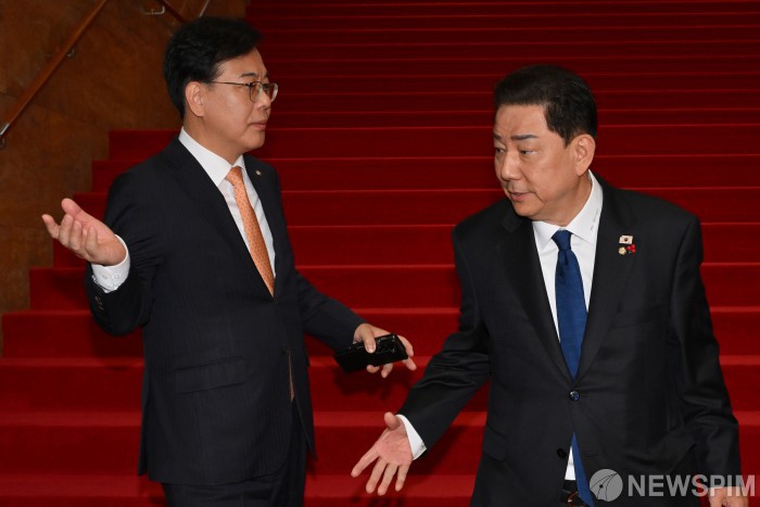 [서울=뉴스핌] 정일구 기자 = 김병기 더불어민주당 원내대표와 송언석 국민의힘 원내대표가 9일 서울 여의도 국회에서 우원식 국회의장 주재 회동을 마치고 대화하고 있다. 2025.12.09 mironj19@newspim.com