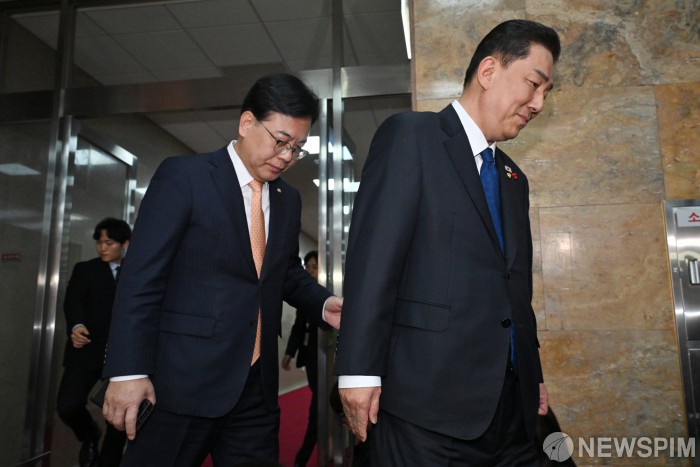 [서울=뉴스핌] 정일구 기자 = 김병기 더불어민주당 원내대표와 송언석 국민의힘 원내대표가 9일 서울 여의도 국회에서 우원식 국회의장 주재 회동을 마치고 이동하고 있다. 2025.12.09 mironj19@newspim.com
