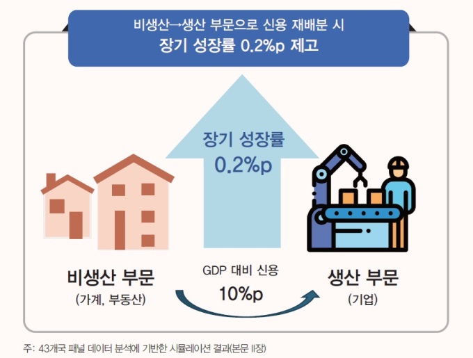 연구진은 가계신용을 GDP 대비 90.1%→80.1%로 낮추고 기업신용을 110.5%→120.5%로 높이는 방식의 신용 재배분이 이뤄질 경우 성장률이 연 1.9%에서 2.1%로 개선될 수 있다고 설명했다.