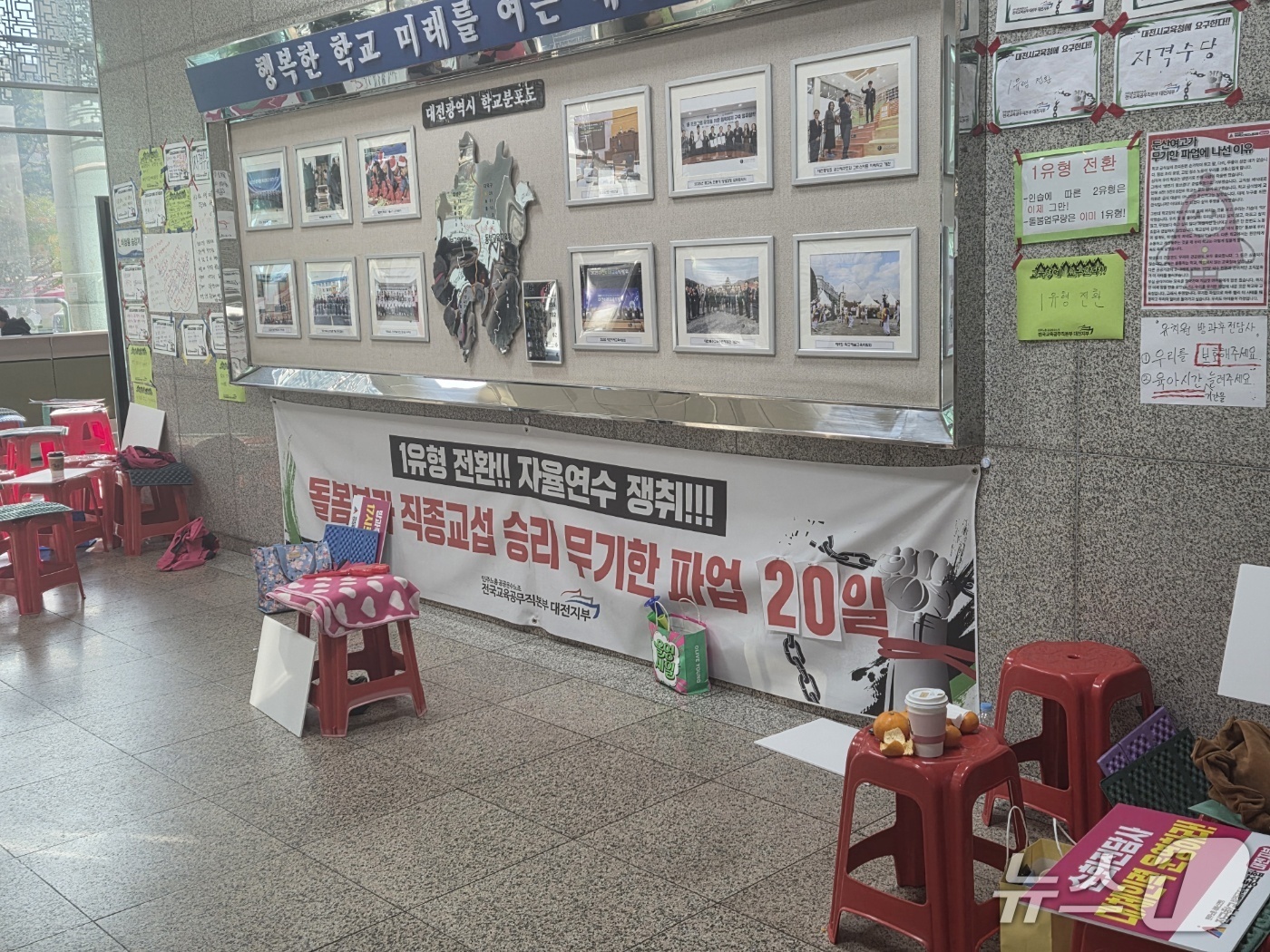 (대전=뉴스1) 김종서 기자 = 전국 학교비정규직연대회의의 순차적 총파업과 별개로 무기한 파업을 이어가고 있는 대전 학비노조가 대전시교육청에서 점거 농성을 벌이면서 교육당국과의 갈등이 고조되고 있다.