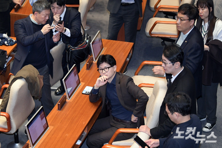 지난해 12월 3일, 국민의힘 한동훈 대표가 의원들과 함께 있는 모습. 윤창원 기자 |
