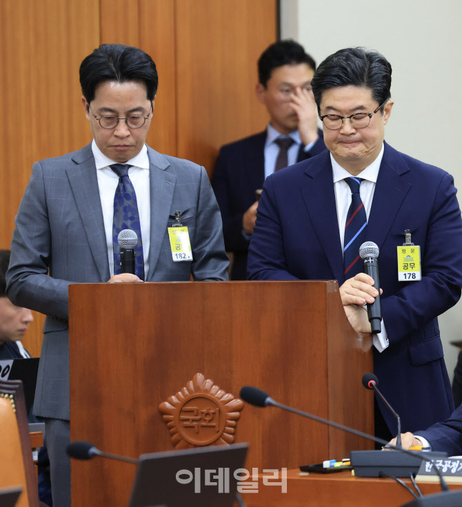 조좌진(왼쪽) 롯데카드 대표이사와 김병주 MBK파트너스 회장이 지난 10월 14일 국회에서 열린 정무위원회의 공정거래위원회 등에 대한 국정감사에 증인으로 출석, 의원 질의를 들으며 굳은 표정을 보이고 있다. (사진=이데일리 노진환 기자) |