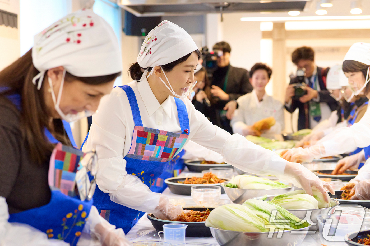 (서울=뉴스1) 허경 기자 = 김혜경 여사가 9일 서울 종로구 북촌 한식문화공간 이음에서 열린 주한대사 배우자 초청 김장 행사에서 참석자들과 함께 김치를 담그고 있다. (대통령실 제공. 재판매 및 DB 금지) 2025.12.9/뉴스1