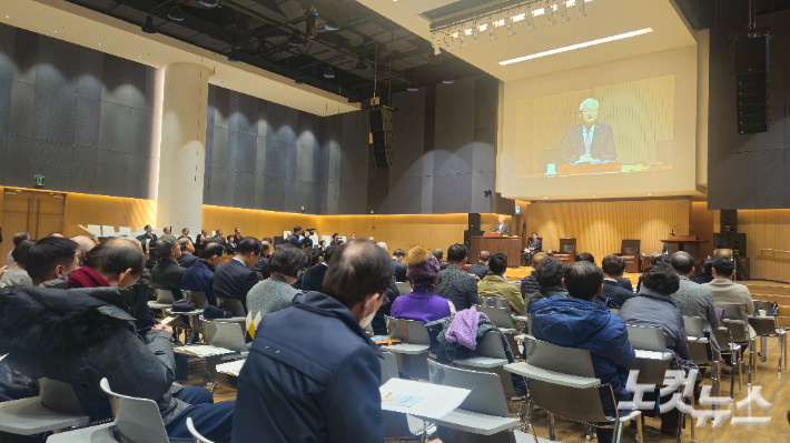 한국기독교탈북민정착지원협의회(이사장 정성길 장로, 지도목사 박원영)가 9일 오후 서울 종로구 새문안로 새문안교회 언더우드홀에서 사역보고와 후원 감사 예배를 드렸다. 한정협 3대 이사장을 역임한 정성진 목사가 예배 설교를 하고 있다. 송주열 기자 |
