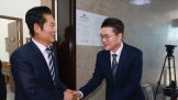 더불어민주당 김병기 원내대표(오른쪽)와 국민의힘 송언석 원내대표가 9일 국회에서 우원식 국회의장 주재로 여야 회동을 마친 뒤 서로 쳐다보지 않은 채 대화하고 있다. 이날 오전 열린 우 의장 주재 회동에서 여야는 본회의에 상정할 안건을 두고 합의점을 도출하지 못했다.