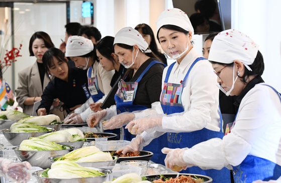 김혜경 여사(오른쪽 둘째)가 9일 서울 종로구 북촌 한식문화공간 ‘이음’에서 주한 외국 대사 배우자들과 함께 김장을 하고 있다. 이날 행사에는 일본·영국·프랑스·캐나다·태국·인도·아르헨티나·호주 등 11개국 대사의 배우자가 참석했다. [사진 대통령실사진기자단]