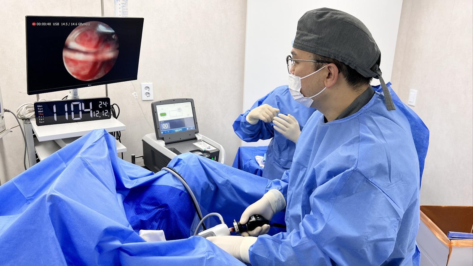 ‘전립선 명의’ 나인비뇨의학과의원 박수환 원장이 전립선비대증 환자에게 리줌 시술을 하고 있다. 박 원장은 “리줌은 전립선의 건강한 조직과 기능이 손상되지 않아 발기부전이나 역행성 사정 같은 성기능 장애 발생 가능성이 매우 낮다”고 말했다. 나인비뇨의학과의원 제공 |