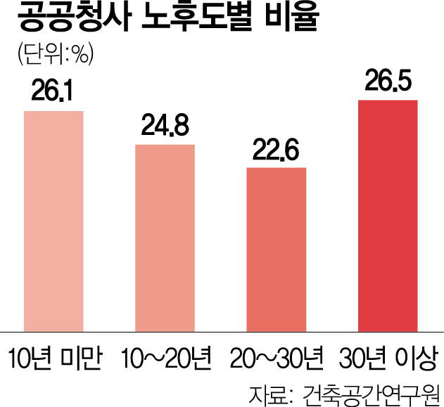 9일 국토부에 따르면 국토부는 전국의 모든 노후 청사를 대상으로 노후 공공청사 복합개발 사업 희망 여부를 조사했다. 설문지에는 준공 연도, 복합개발 희망 여부, 개발 시 애로 사항 등이 기재됐다. 국토부 관계자는 “사업지를 발굴하기 위해 전수조사를 실시했다”며 “2030년까지 2만 8000가구를 공급하겠다는 목표를 맞추기 위해 노력하겠다”고 말했다. 건축공간연구원에 따르면 준공 후 30년이 지난 노후 공공 건축물은 2020년 기준으로 5만 2604동에 달한다. 전국 공공 건축물 중 서울의 비중이 5.5%인 것을 감안하면 서울에만 수천 개의 노후 청사가 있을 것으로 추정된다.