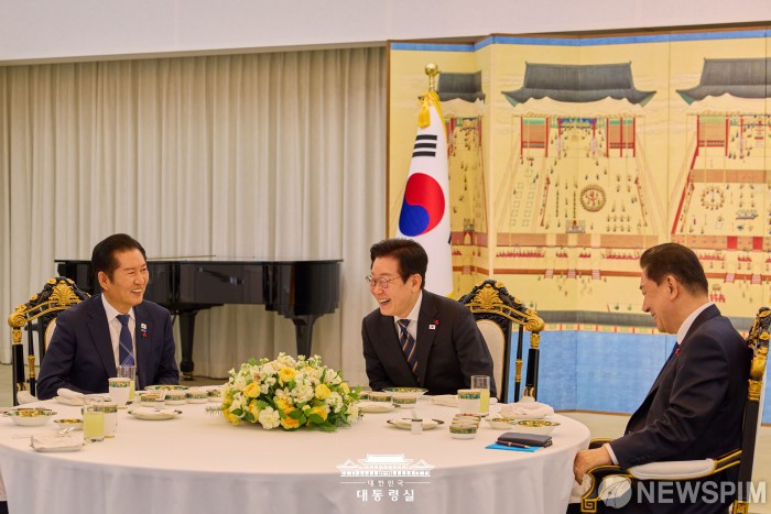 [서울=뉴스핌] 이재명 대통령이 지난 9일 서울 한남동 관저에서 정청래 더불어민주당 대표, 김병기 원내대표와 만찬을 하고 있다. [사진=대통령실] 2025.12.10 photo@newspim.com
