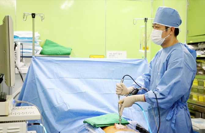 단일공 내시경 수술 중인 강북힘찬병원 신경외과 김민규 원장. |