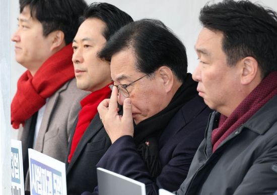 송언석 국민의힘 원내대표가 10일 국회 본청 앞에서 '더불어민주당의 8대 악법' 저지 릴레이 천막농성장에서 안경을 고쳐쓰고 있다. 국민의힘은 이른바 '8대 악법' 저지 시점까지 농성을 이어갈 방침이다. 2025.12.10 김현민 기자 |