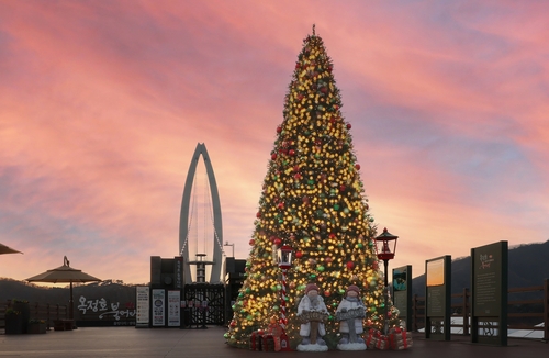 (임실=연합뉴스) 전북 임실군의 대표 관광지인 옥정호 출렁다리와 붕어섬 생태공원에 대형 트리 등 성탄절 조형물이 설치돼 관광객들의 호응을 얻고 있다.