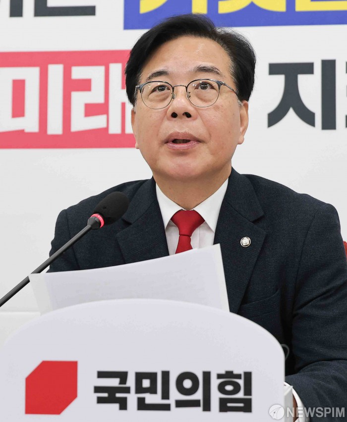 [서울=뉴스핌] 윤창빈 기자 = 송언석 국민의힘 원내대표가 10일 오전 서울 여의도 국회에서 현안 관련 기자간담회를 하고 있다. 2025.12.10 pangbin@newspim.com
