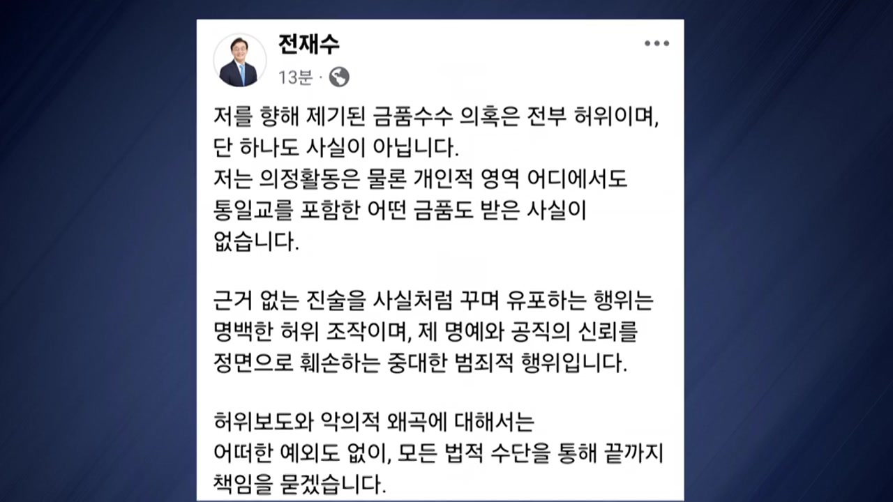 통일교로부터 금품을 수수했다는 민주당 인사가 전재수 해양수산부 장관이라는 의혹이 제기된 가운데, 전 장관은 관련 의혹은 모두 허위라고 반박했습니다.