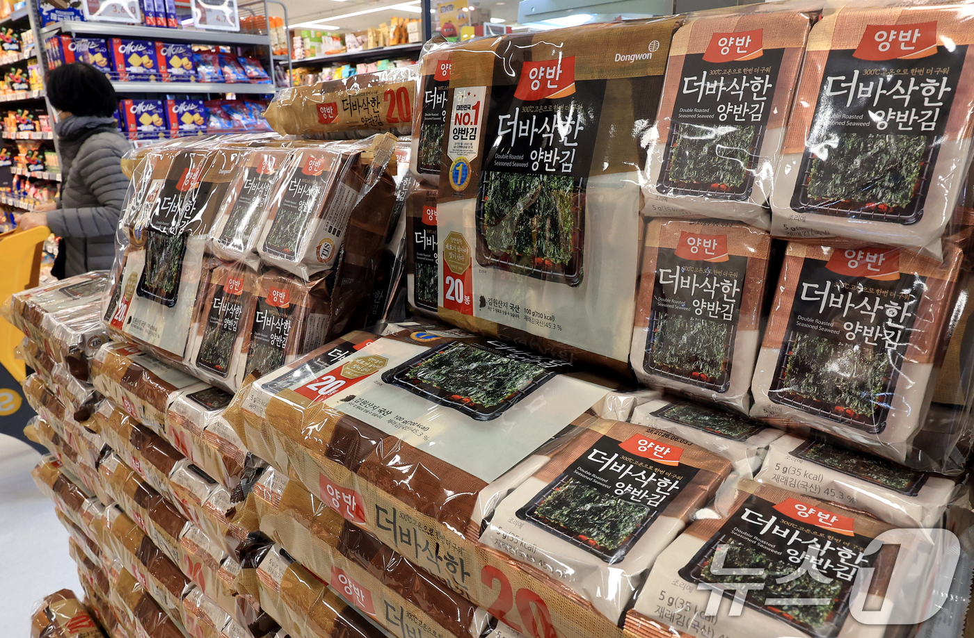(서울=뉴스1) 이호윤 기자 = 10일 서울시내 한 대형마트에 김이 진열돼 있다. 지난 9일 관세청에 따르면 올해 1~11월 농·축·수·산물, 가공식품 등 K-푸드 수출액은 1년 전보다 7% 늘어난 103억 7천500만 달러로 집계됐다. 품목별로는 라면(13.3%), 김(10.0%)이 1위, 2위로 가장 수출액 비중이 컸다. 라면 수출액은 전년 대비 21.4%, 김은 13.3% 증가했다. 2025.12.10/뉴스1