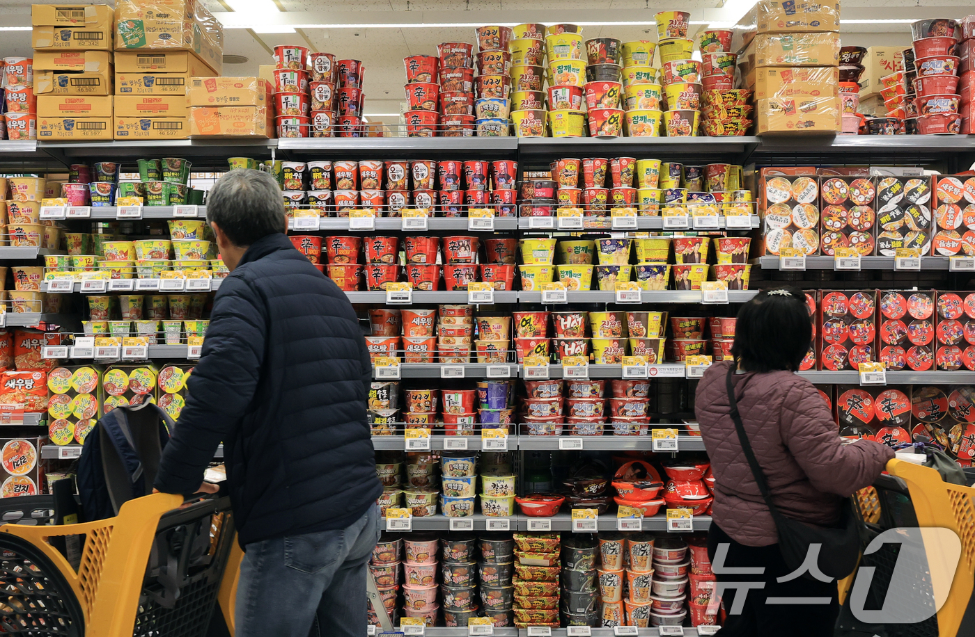 (서울=뉴스1) 이호윤 기자 = 10일 서울시내 한 대형마트에 컵라면이 진열돼 있다. 지난 9일 관세청에 따르면 올해 1~11월 농·축·수·산물, 가공식품 등 K-푸드 수출액은 1년 전보다 7% 늘어난 103억 7천500만 달러로 집계됐다. 품목별로는 라면(13.3%), 김(10.0%)이 1위, 2위로 가장 수출액 비중이 컸다. 라면 수출액은 전년 대비 21.4%, 김은 13.3% 증가했다. 2025.12.10/뉴스1
