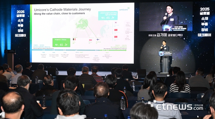 한국산업기술기획평가원과 전자신문이 공동 주최하고 산업통상부가 후원한 '2025 글로벌 소재·부품·장비 테크페어'가 '위기돌파를 위한 공급망 스페셜티 확보 전략'을 주제로 10일 서울 강남구 섬유센터빌딩에서 열렸다. 김기태 유미코아 글로벌디렉터가 '유미코아 양극 기술 솔루션 및 미래 전기차 전략: 지속 가능한 글로벌 공급 로드맵 구축'을 주제로 기조강연을 하고 있다.