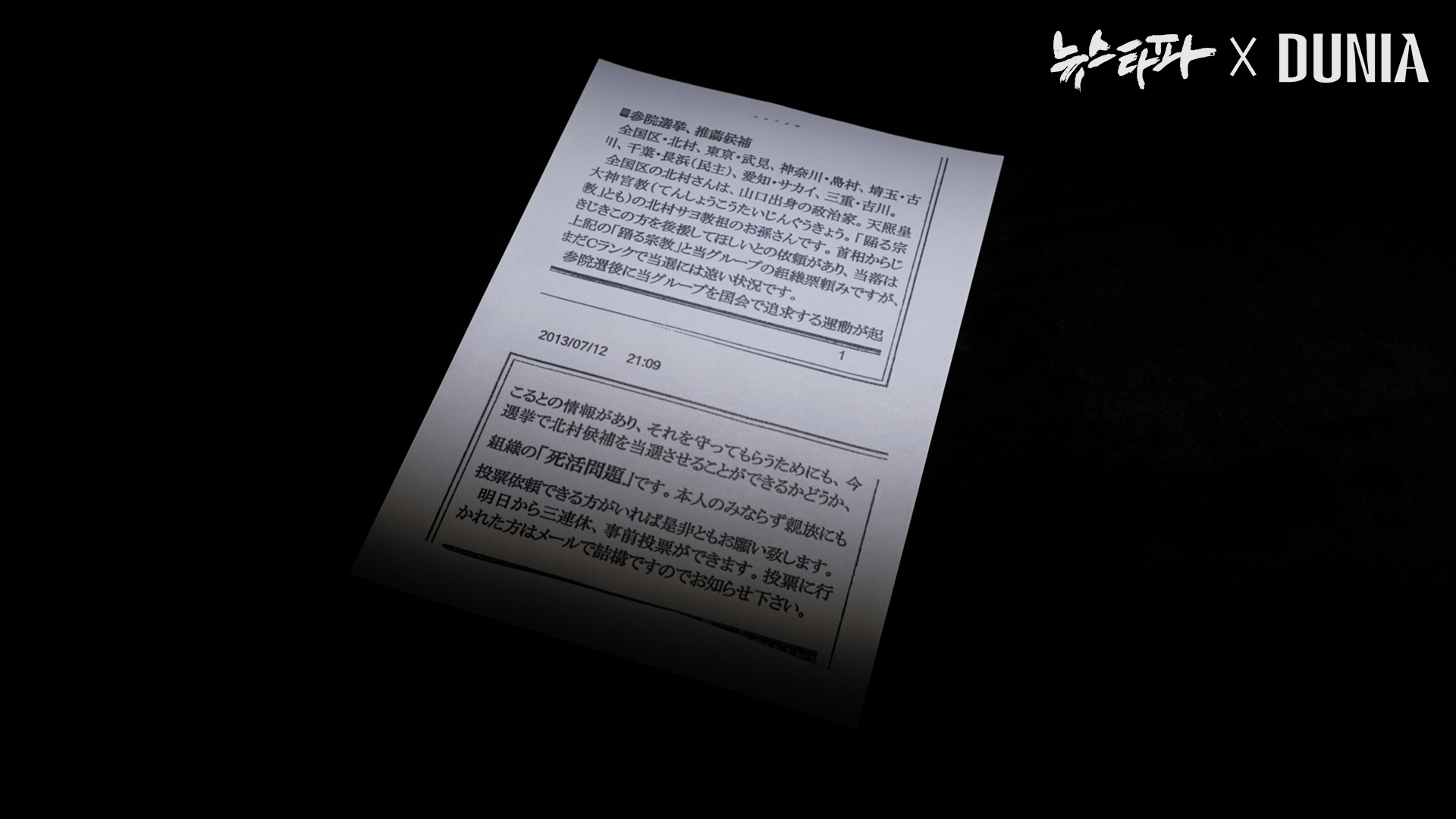 세계평화통일가정연합(이하 통일교)과 윤석열 정치권력이 민주 국가의 상징인 투표를 매개로 대한민국 헌정 사상 초유의 정교유착 게이트를 빚었다는 사실이 계속해서 드러나고 있다. 그런데 통일교가 이와 완전히 같은 정교유착 모델을 이미 약 10년 전에 일본에서 성공적으로 정착시킨 사실이 두니아·뉴스타파 공동취재 결과 확인됐다.