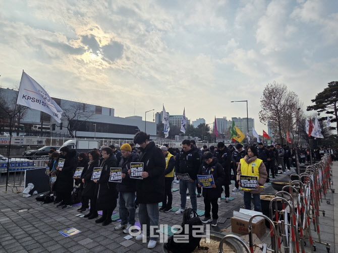 10일 오후 2시 용산 대통령실 맞은편에서 열린 ‘김용균 7주기 추모 결의대회’에서 묵념을 하고 있는 시민들의 모습이다. (사진=염정인 기자) |