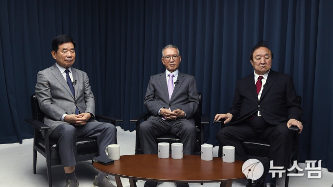 [서울=뉴스핌] 한태희 기자 = 정대철 헌정회장(왼쪽 세번째), 김진표 전 국회의장(왼쪽 첫번째), 김형오 전 국회의장(가운데)이 뉴스핌TV 스튜디오에서 '국가 리스크된 정치 양극화, 어떻게 풀 것인가'를 주제로 대담하고 있다. [사진=뉴스핌] 2025.12.10 ace@newspim.com |