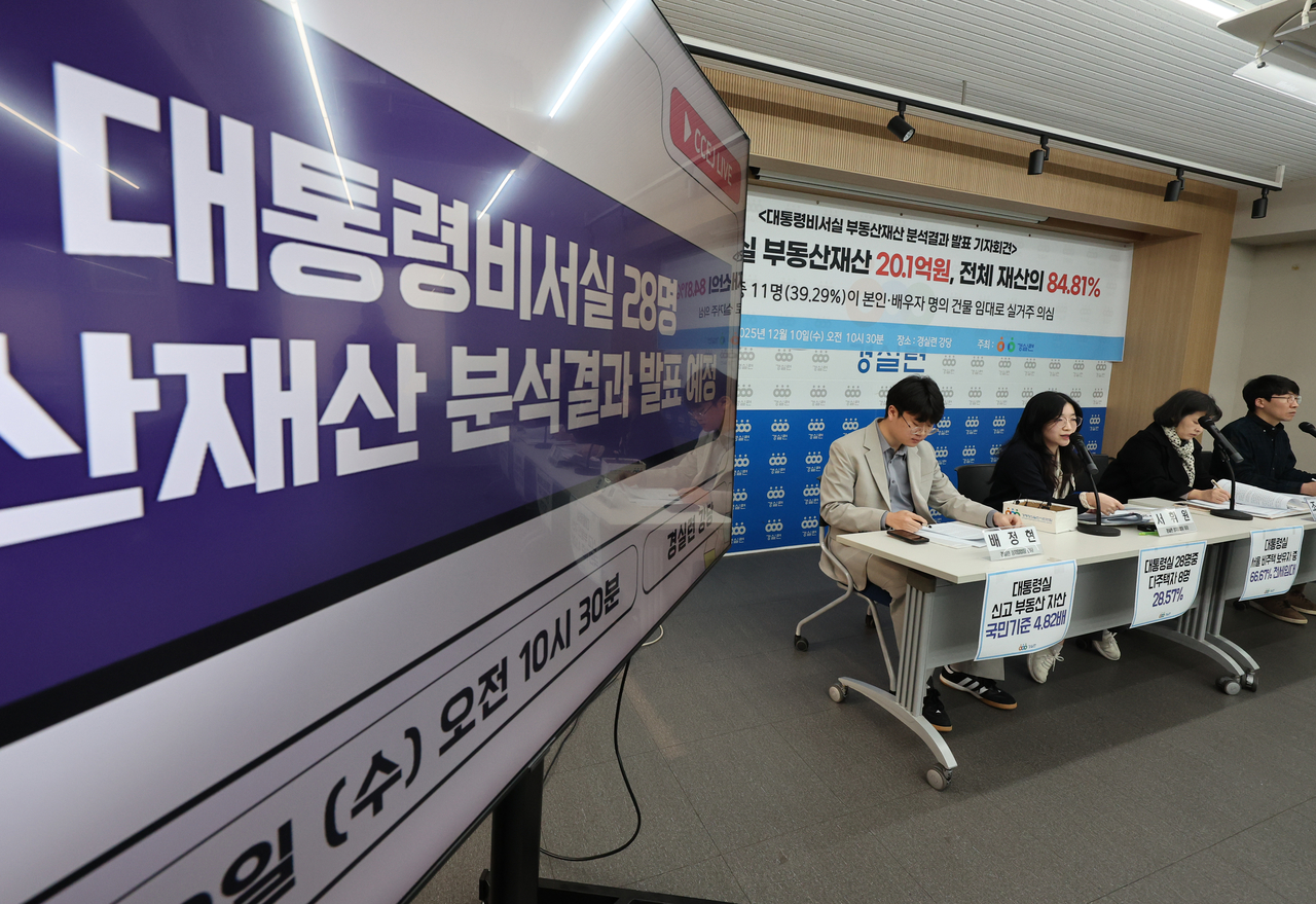 서휘원 경실련 정치입법팀장은 이날 “서울 평균 집값이 12억4000만원인데, 대통령실 평균 부동산 재산이 20억원을 넘는다는 건 정책을 설계하는 사람들의 현실이 서민·청년과 지나치게 동떨어져 있다는 의미”라며 “국민에게는 대출 규제로 시장 진입을 막으면서 고위공직자들은 강남 다주택·임대로 자산을 불리는 구조가 반복되고 있다”고 비판했다.