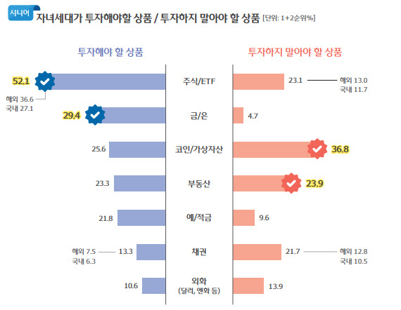 10일 우리금융그룹이 ‘AI시대의 시니어 라이프’를 주제로 발간한 트렌드 보고서에 따르면 자녀세대가 투자해야 할 상품 1, 2순위로 주식·ETF를 선택한 비중이 52.1%로 가장 많았다. 해외 주식이 36.6%, 국내 주식이 27.1%로 높았고 금·은 등의 안전자산(29.4%) 또한 자녀세대에게 투자상품으로 추천했다. 반면 자녀세대가 투자하지 말아야 할 상품으로는 코인·가상자산이 36.8%로 가장 많았고 부동산이 23.9%로 뒤를 이었다.
