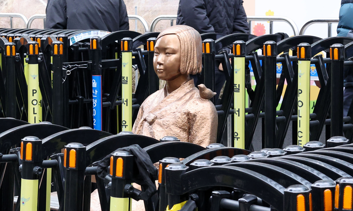 경찰 철제 울타리는 2020년 6월 설치된 뒤 5년 넘게 유지되고 있다. 소녀상 훼손을 우려한 종로구청의 시설보호 요청에 따른 조치다. 소녀상 철거를 주장하는 집회가 과격해지자 구청이 나선 것인데, 여전히 이들 집회는 매주 열린다. 세계인권선언 77주년을 맞은 10일 집회 참가자들은 소녀상 바로 옆에서 위안부 피해자들을 조롱하고 비아냥거리고 있었다.