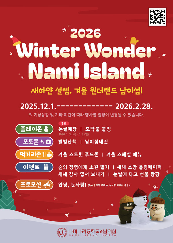 산책 중 추위가 스며들면 곳곳에 마련된 모닥불터가 따뜻함을 전한다. 불멍과 함께 마시멜로, 쫀득이 등 추억의 간식을 즐길 수 있으며, 어묵·찐빵·호떡 등 대표적인 겨울 간식이 마련돼 여행의 즐거움을 높인다. 남이섬 겨울 여행의 하이라이트 중 하나인 무료 눈썰매장은 2026년 1월 3일부터 2월 8일까지 운영되며, 별도 이용료 없이 누구나 이용할 수 있어 가족·어린이·연인 모두에게 매년 큰 호응을 얻고 있다. 이 외에도 스토리투어버스·나눔열차·짚와이어 등 체험 콘텐츠가 더해져 다채로운 겨울 여행을 완성한다.
