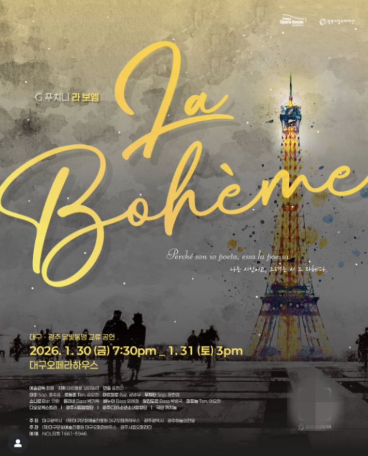 '라 보엠'은 19세가 파리 라틴지구를 배경으로 시인 로돌포와 재봉사 미미, 화가 마르첼로와 가수 무제타 등 젊은 보헤미안 청춘들의 열정과 고단한 삶, 그리고 애절한 사랑 이야기를 섬세하게 그려낸 스테디셀러이다. '겨울 오페라의 정수'로 불리며 전 세계 주요 오페라하우스에서 꾸준히 사랑받는 이 작품은 '내 이름은 미미' '그대의 찬 손' 등 주옥같은 아리아로 관객의 심금을 울린다. 이 작품은 지난 12월 광주예술의전당 공연에서 이미 전석 매진을 기록하며 작품성을 인정받았기에, 대구 무대에서도 뜨거운 호응이 예상된다.