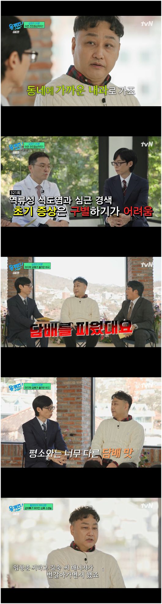 10일 방영된 tvN ‘유퀴즈 온 더 블럭’(이하 ‘유퀴즈’)에셔는 코미디언 김수용이 등장했다. 김수용은 “그날 아침에 일어나는데, 가슴이 너무 뻐근했다. 진짜 부끄러워서 말을 안 했는데, 아내가 병원을 가야 하는 거 아니냐고 하는데 내가 파스를 붙이겠다고 했다. 핫이냐, 쿨이냐, 뜨거운 건 그래서 쿨을 붙였다. 김숙이랑 유튜브도 편하게 찍는 거여서, 매니저 없이 내가 운전을 해서 갔다”라며 그날에 대해 떠올렸다.