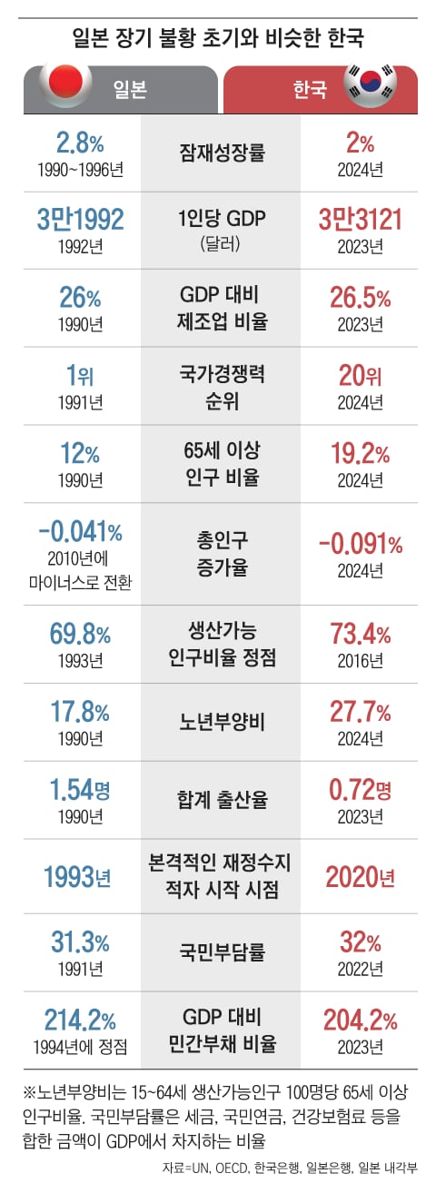 저성장 장기화를 의미하는 일본화(Japanification)를 위기로 받아들여야 하는 진짜 이유는 한국 경제가 아직 그 충격을 흡수할 만큼 맷집이 강하지 못하기 때문이다. 버블 붕괴 당시 일본은 65세 이상 인구 비율이 12%였지만, 한국은 작년 말 20%를 넘었다. 당시 일본은 대외 자산이 부채보다 많은 세계 1위 순채권국으로, 수출이 부진해도 해외에 깔아놓은 자산에서 나오는 막대한 이자와 배당금으로 버틸 수 있었다. 반면 한국은 순채권국에 진입한 지 10년 남짓에 불과하다. 당시 일본이 청년 부자였다면, 지금 한국은 노후 준비가 덜 된 노인에 비유할 수 있다. 일본처럼 추락할 때 펼칠 낙하산도 제대로 갖추지 못한 한국이 일본의 전철을 밟는다면 어떤 결과를 맞을까. 생각만 해도 등골이 서늘해진다.