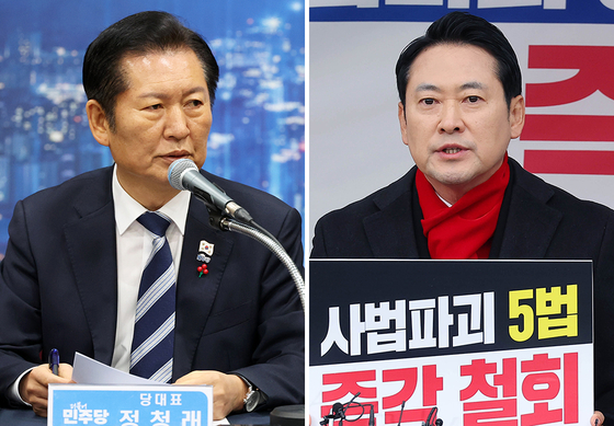 정청래 더불어민주당 대표가 10일 광주광역시 김대중컨벤션센터에서 열린 최고위원회의에서 발언하고 있다(왼쪽 사진). 같은 날 장동혁 국민의힘 대표가 국회 본관 앞 ‘8대 악법 저지’ 릴레이 천막농성장에서 발언하고 있다. [연합뉴스]