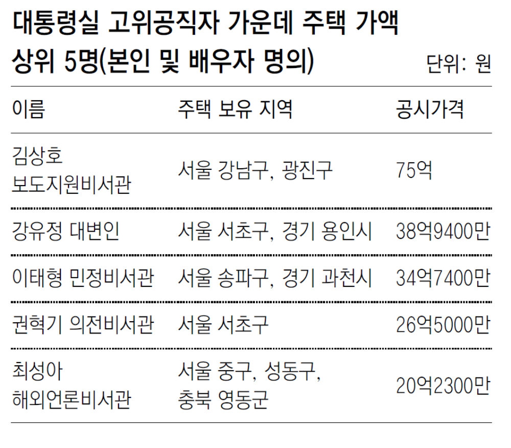 경실련에 따르면 이들이 신고한 건물·토지 등 부동산 재산 평균 신고액은 20억3159만 원이다. 국민 가구 평균(4억1752만 원)의 4.9배에 이르는 규모다. 특히 상위 5명의 평균 부동산 재산 신고액은 54억2028만 원에 달했다. 김 비서관이 75억 원으로 가장 많았으며, 이 비서관(58억5000만 원)과 문진영 사회수석비서관(52억 원), 최성아 해외언론비서관(46억5000만 원), 강 대변인(38억9000만 원)이 뒤를 이었다.