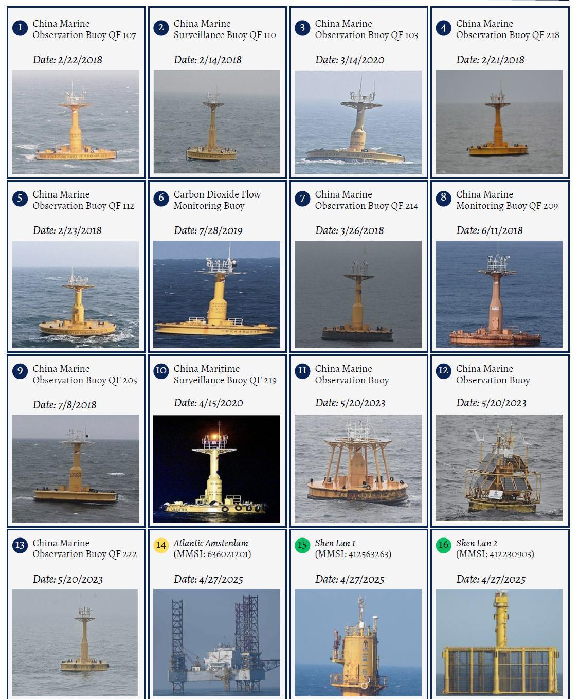 미국 전략국제문제연구소(CSIS) 산하 북한 전문 매체 ‘비욘드 패럴렐’은 9일(현지 시간) 중국이 한중 공동 관리 구역인 서해 잠정조치수역(PMZ)에 일방적으로 시설물을 설치하며 ‘점진적 주권 확장’을 시도 중이라고 밝혔다. 사진은 2018년부터 2025년 4월까지 중국이 서해에 설치한 각종 시설물 현황으로 1∼13번은 부표, 14번은 양식장 관리 및 해양 환경 관측 등을 위한 시설, 15∼16번은 양식장이다. 사진 출처 비욘드 패럴렐 홈페이지 |