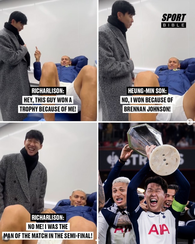 손흥민은 토트넘 내부 시설로 들어가 옛 동료들도 만났다. 히샬리송을 만났는데, 히샬리송은 보자마자 "이 친구 우승 나 덕분에 했다"라며 장난을 쳤다. 그러자 손흥민은 UEFA 유로파리그(UEL) 결승전에서 결승골을 넣은 브레넌 존슨 덕분이라고 말했고, 히샬리송은 이에 질세라 "아니다. 나다. 내가 준결승 MOM이었다"라고 주장했다. 화기애애한 분위기는 여전했다.