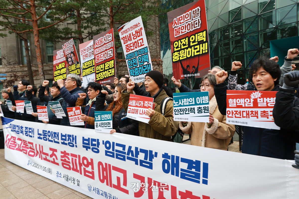 서울교통공사노동조합 조합원들이 지난달 25일 서울시청 앞에서 ‘쟁의행위 찬반투표 결과 및 총파업 예고 기자회견’을 대규모 인력감축 중단, 임금삭감 해결, 노동 안전 등 보장을 촉구하고 있다. 정지윤 선임기자 |