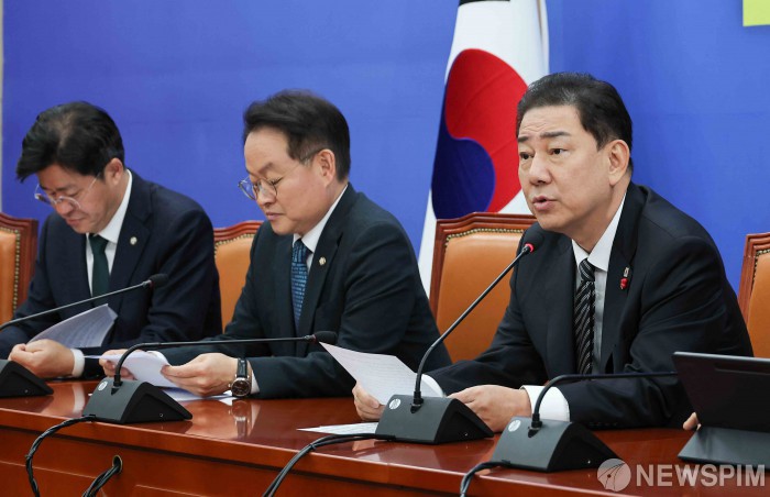 [서울=뉴스핌] 윤창빈 기자 = 김병기 더불어민주당 원내대표가 11일 서울 여의도 국회에서 열린 정책조정회의에서 모두발언을 하고 있다. 2025.12.11 pangbin@newspim.com
