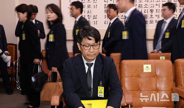 [서울=뉴시스] 김명년 기자 = 문지석 광주지검 부장검사가 23일 오전 서울 여의도 국회 법제사법위원회에서 열린 서울고등검찰청-서울중앙지방검찰청 등에 대한 국정감사가 중지된 후 이동하는 검사들을 뒤로한 채 자리에 앉아 있다. 2025.10.23. kmn@newsis.com |