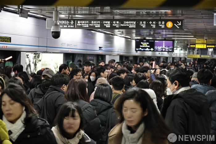[서울=뉴스핌] 양윤모 기자 = 서울지하철 1∼8호선을 운영하는 서울교통공사 노조의 총파업 예고일을 하루 앞둔 11일 충무로역에서 시민들이 지하철을 이용하고 있다. 2025.12.11 yym58@newspim.com