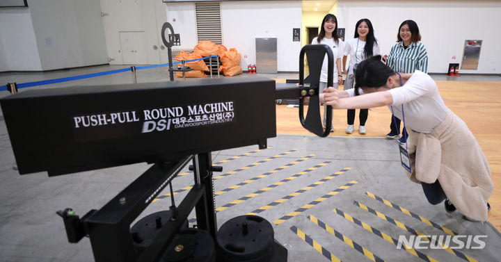 [인천=뉴시스] 전진환 기자 = 18일 오전 인천 연수구 송도컨벤시아에서 열린 2023 국제치안산업대전에서 한 관람객이 경찰 순환식 체력검사 체험을 하고 있다. 2023.10.18. amin2@newsis.com |