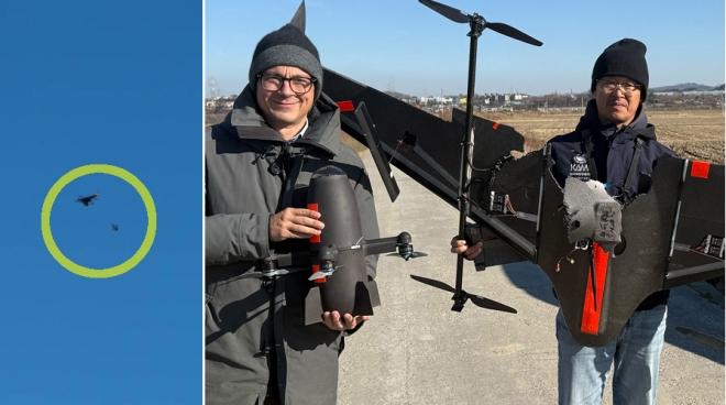 (왼쪽) 12월 8일 충남 인근에서 진행된 실사격 시험 중 요격드론 ‘카이든’이 표적에 접근하는 장면. (오른쪽) 니어스랩 연구진과 L3해리스테크놀로지스 관계자들이 시험 성공 후 기념 촬영을 하고 있다. 니어스랩 제공 |
