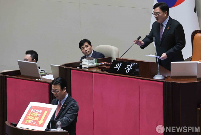 [서울=뉴스핌] 윤창빈 기자 = 곽규택 국민의힘 의원이 11일 서울 여의도 국회에서 열린 본회의에서 형사소송법 일부개정법률안(대안)에 대한 무제한 토론을 하던 중 우원식 국회의장이 발언하고 있다. 2025.12.11 pangbin@newspim.com |