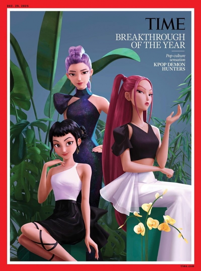 타임은 지난 9일(현지시간) '2025 올해의 돌파구(Breakthrough of the Year)'로 케데헌을 지목하며 12월 29일자 표지에 주역 캐릭터 루미·미라·조이를 전면 배치했다.